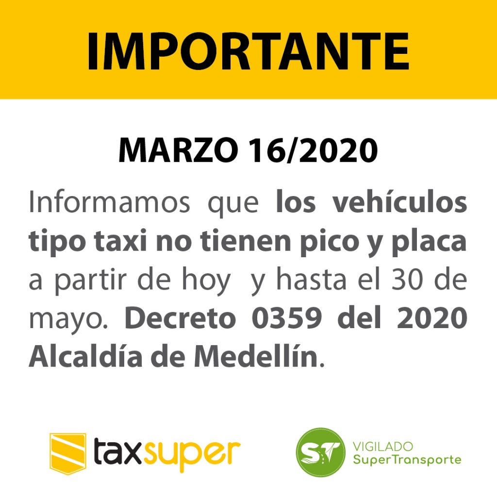 Se le informan a los conductores que los taxis no tienen pico y placa a partir de hoy y hasta el 30 de mayo. Decreto 0359 del 2020 alcaldía de Medellin.